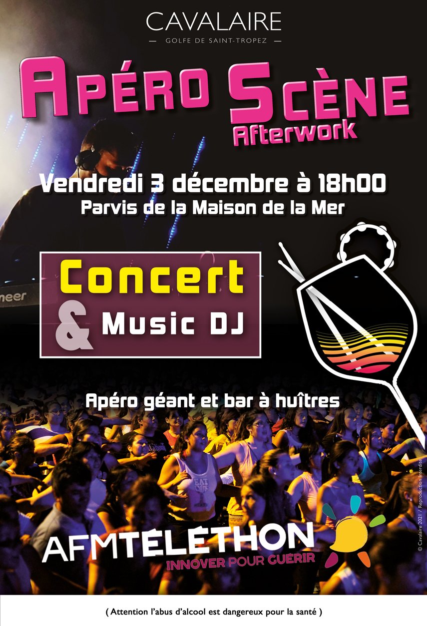 Nouvel apéro scène au profit du Téléthon et de la recherche contre les maladies rares, cette soirée sera l'occasion de profiter d'un apéro proposé par l'association Dynamique Ensemble et d'un bar à huitres, avec en animation DJ Titou mais aussi un concert live sur le parvis de la Maison de la mer.